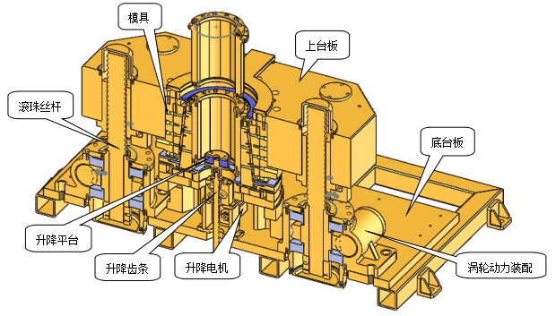 功能描述:將填充好襯墊載體的殼體放入升降平臺上,啟動(dòng)設備,升降電機動(dòng)作,帶動(dòng)升降齒條將殼體下降至縮徑位置。然后兩側電機同步啟動(dòng)動(dòng)力帶動(dòng)齒輪箱轉動(dòng),兩端滾珠絲桿帶動(dòng)上臺板下移,進(jìn)行縮徑加工,而后,兩側伺服電機反轉,上臺板上移復位,加工好的產(chǎn)品通過(guò)步進(jìn)電機帶動(dòng)的升降齒條端部的升降平臺拖出模具,拿取工件。